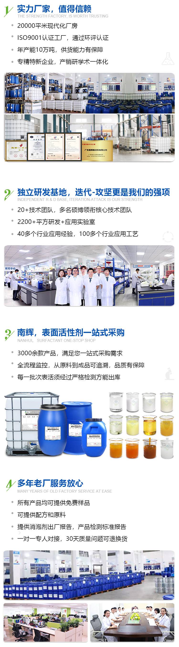 广东南辉新材料有限公司,是一家致力于表面活性剂研发、生产、销售为一体的国家高新技术企业,拥有独立的研发基地,主要研发产品有:乳化剂、渗透剂、匀染剂、司盘、吐温、消泡剂等3000余款产品。南辉拥有20000平方米的现代化生产车间,年产能可达10万吨。通过ISO9001:2015质量管理体系认证,已获得十余项不同产品的发明专利授权,被评为广东省"专精特新"企业。从2018年开始批量出口至俄罗斯、日本、马来西亚、印度、秘鲁等国家,已成为国内目前主要的表面活性剂生产厂家。