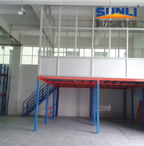 Double use of ground space, improve space utilization, reduce operating costs. According to the warehouse space design platform (3000~6000mm), maximum span weight can reach 1000KG/ square meters, usually collocation lifting platform of goods, efficiency. The floor is spacious, equipped with guardrail, and easy to move up and down stairs. The platform panel can be made of wood board, steel plate or steel gusset plate. The utility model has the advantages of integral appearance, stable structure, safety and disassembly.