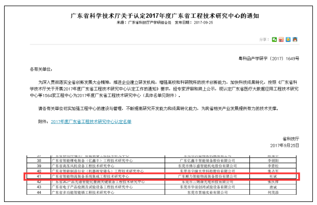 2017年9月25日,省科技厅公布了2017年新认定广东省工程技术研究中心名单,广东顺力申报的“广东省智能物流装备系统集成工程技术研究中心”金榜题名,成功荣获“广东省工程技术研究中心”荣誉称号。
