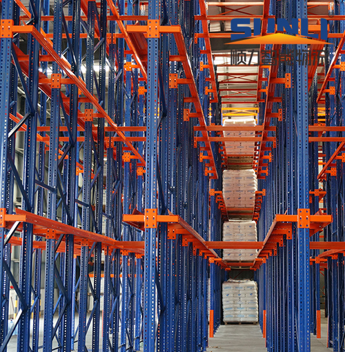 适用于存储样少量多,批量作业且选择性较小的货物。货物采用托盘一个接一个按深度方向,存放在支撑导轨上,增大储存密 度和空间利用率。叉车可直接驶入巷道内存取货物,极为方便。