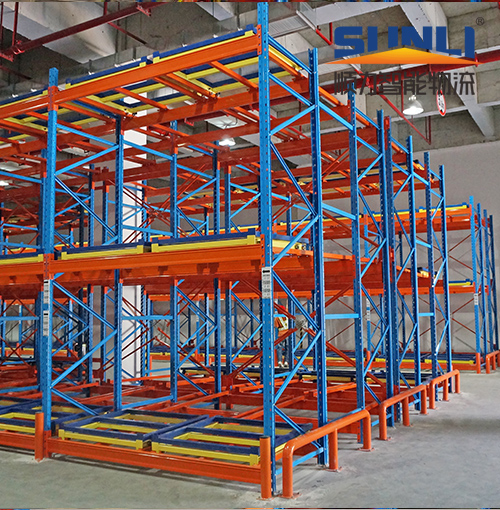 在前后梁间以多层台车重叠相接,从外侧将叠栈货物置于台车推入,后储存之货品会将原先货品推往里面材质:钢制